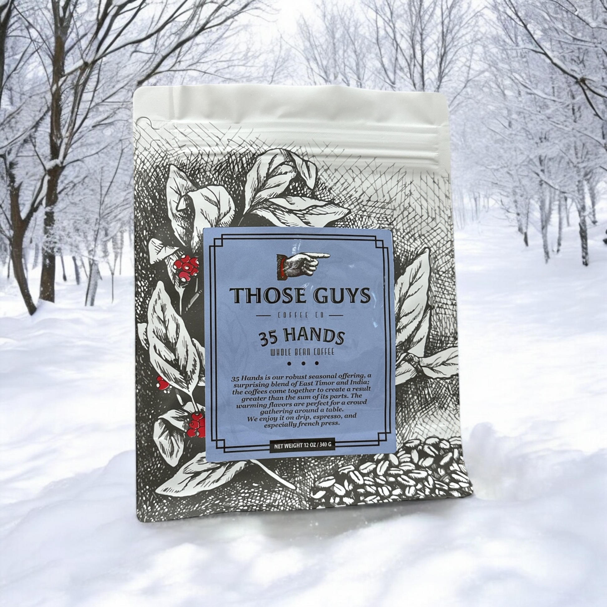 35 Hands is a medium roast and tastes of traditional winter flavors. Complex mulling spices like cinnamon, clove, and orange peel open up to crisp apple acidity, with a long molasses like body and finish.