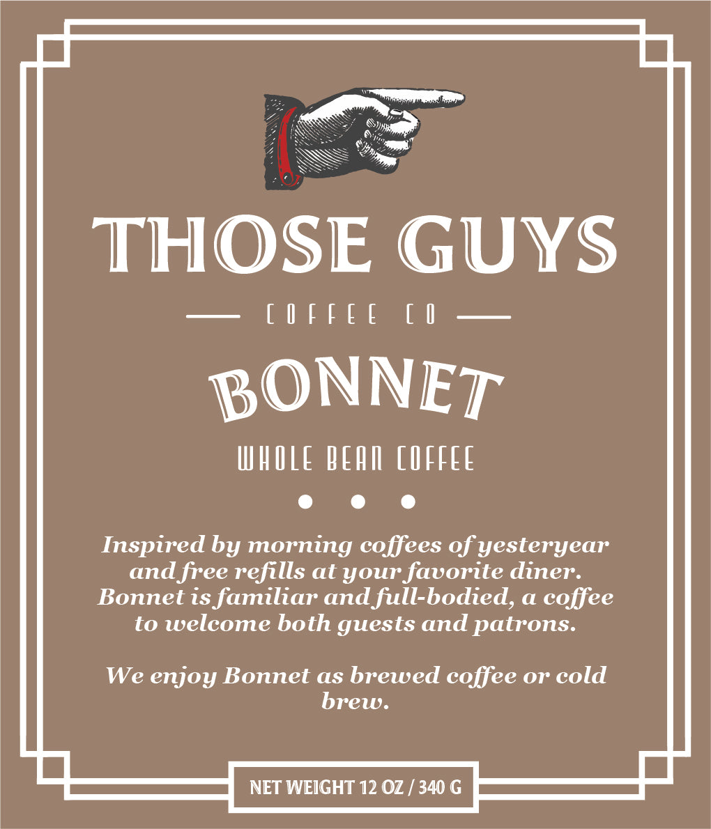 Inspired by morning coffees of yesteryear and free refills at your favorite diner, Bonnet is familiar and full-bodied, a coffee to welcome guests and patrons. All palates will enjoy it. It’s developed enough in the roast to serve well in hot and cold brew formats, but it’s not dark enough to offend those who steer away from dark roasts. This is an excellent coffee to have on hand if you’re only going to have one coffee, whether you’re hosting a dinner at home or serving up coffee daily at a diner.