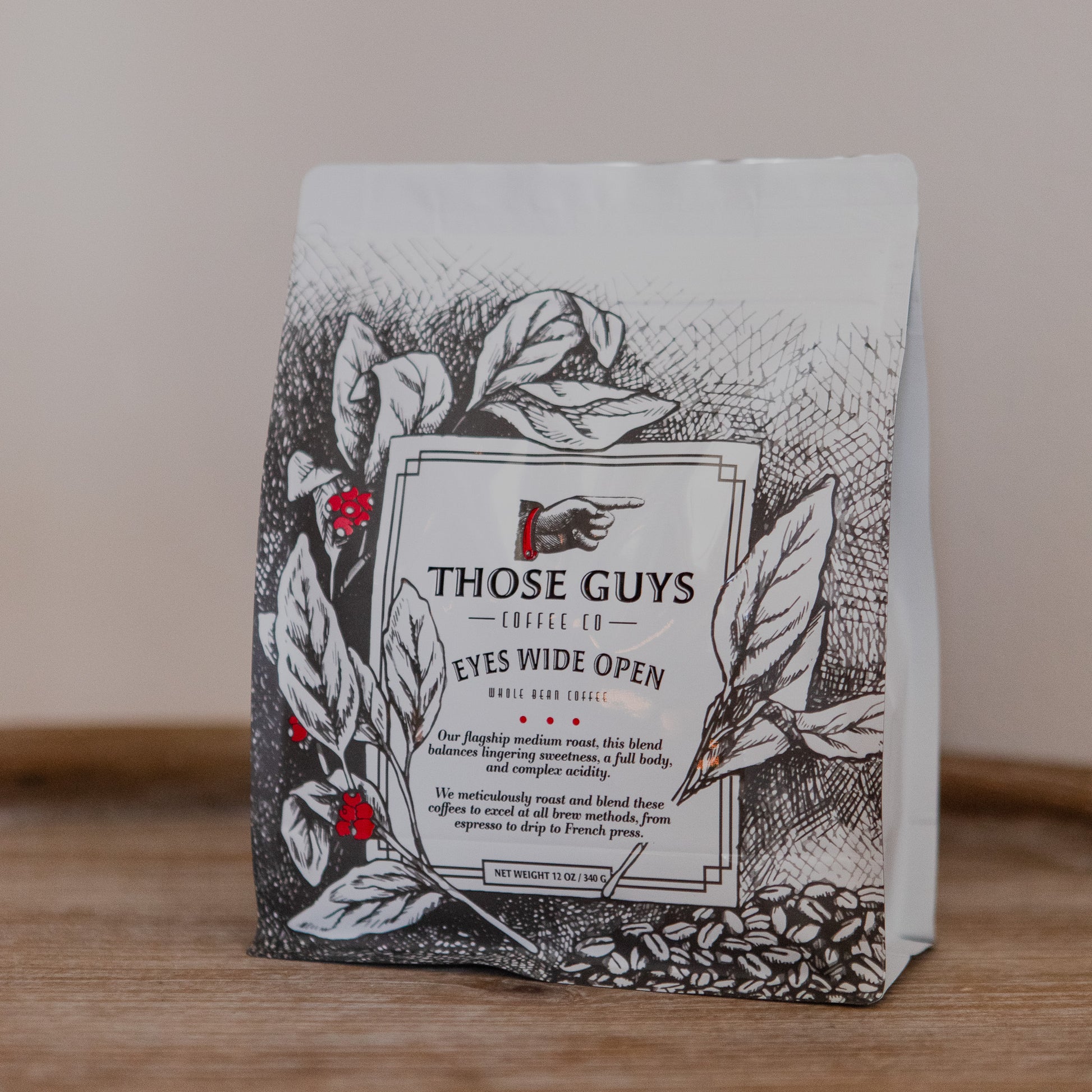 Eyes Wide Open is a blend of coffees, roasted with intention of appealing to the widest range of palates. The flavor profile is generally dried fruits, cocoa, and nuts, but more specifically dates, dark chocolate, and dry-roasted walnuts. The flavor profile develops and improves as it cools.
