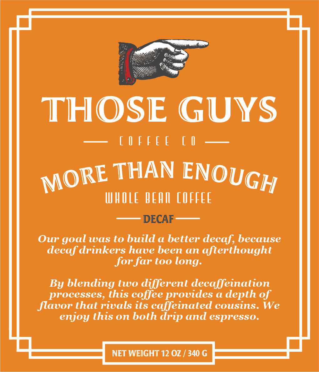 While decaf coffee is often poorly considered and subject to underdeveloped production, More Than Enough is a testament to the possibilities for decaf. Roasted with similar intention to Eyes Wide Open, MTE provides a full flavor experience while still being approachable. 25% of the blend is decaffeinated by the Swiss Water Process, a popular process that uses only water to decaffeinate. Unfortunately in our experience, Swiss Water leaves an unmistakable “decaffy” flavor, which is why we’ve blended it with a delicious Colombian coffee decaffeinated via Ethyl Acetate, a process derived naturally from sugar cane. The result is a full bodied decaf coffee bursting with flavors of gingerbread and caramel. You’ll be surprised decaf coffee can taste so good!