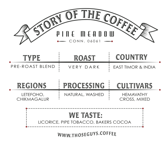 Smithereens is a 50-50 pre-roast blend of a natural East Timor and a washed Indian Hemavathy. The Timor comes from our long-standing partnership with Covoya, whereas the Indian we import ourselves via a direct trade relationship with Poornima and her sustainable, woman-owned farm. The two coffees are similar in density, moisture content, and size, and therefore roast similarly. Blending pre-roast allows the roast profile itself (and its intense caramelized and dry-distillation notes) to take center stage. We roast this blend on our Diedrich IR-5 drum roaster, affectionally known as "Big Red."